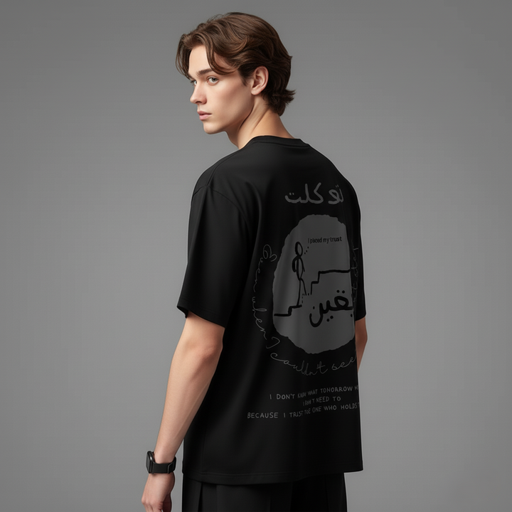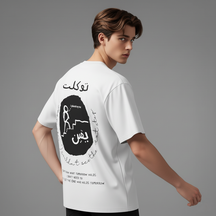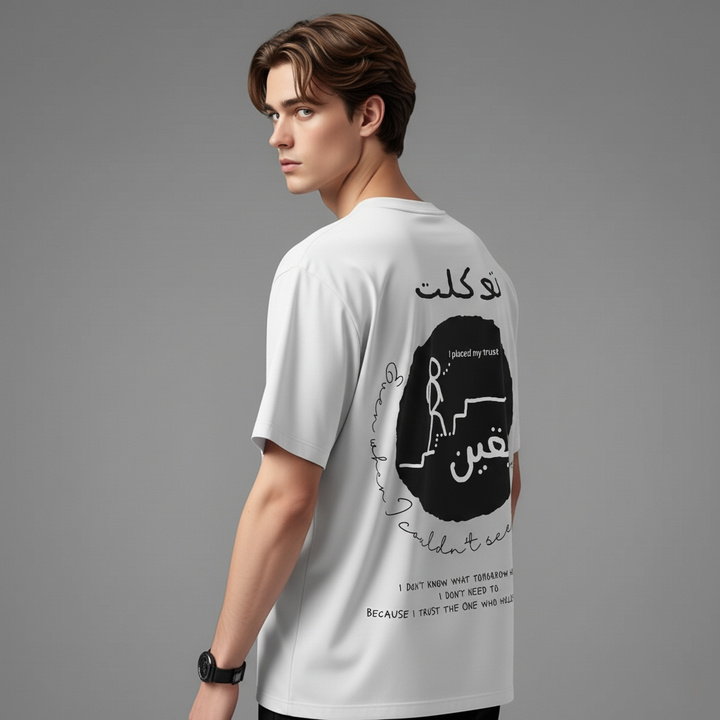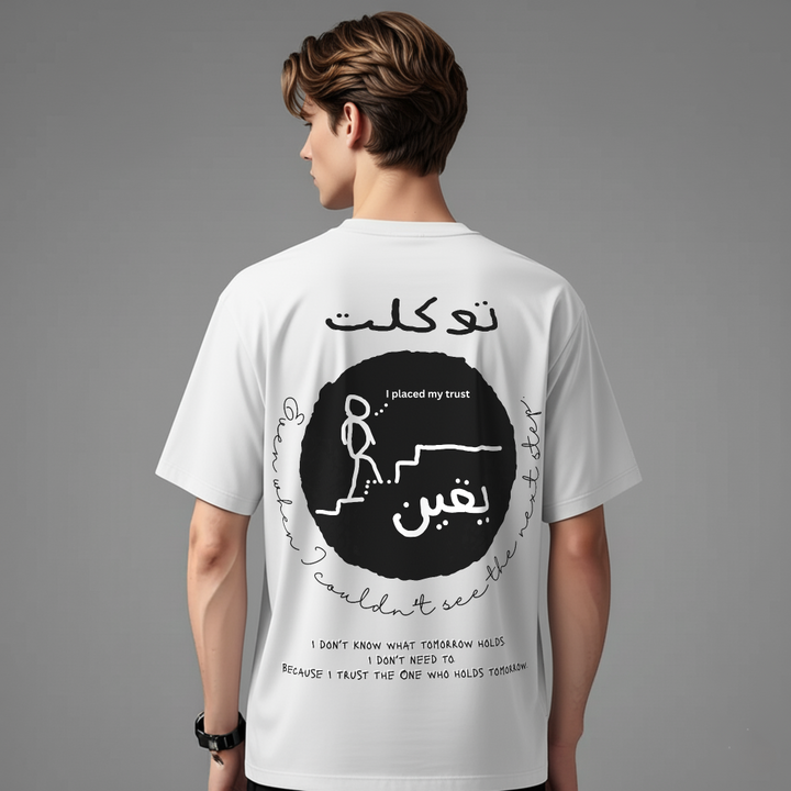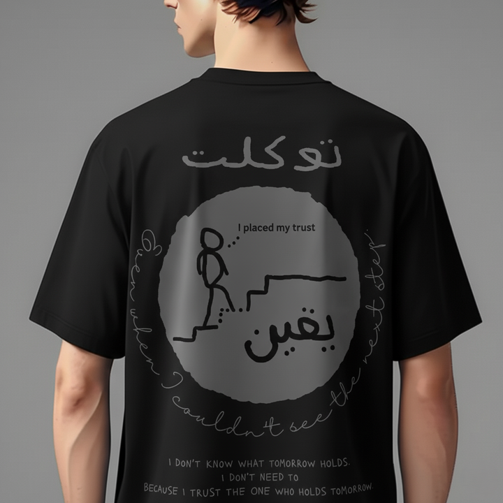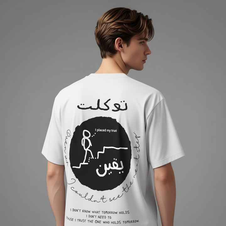 The Tawakkul & Yaqeen oversized T-shirt by Zikrziba carries a message of absolute trust in Allah.